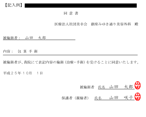 手術や治療をお受けになられる方が未成年の場合は親権者や保護者の方の同意が必要となります。下記の記入例を参考に同意書をご持参下さい。